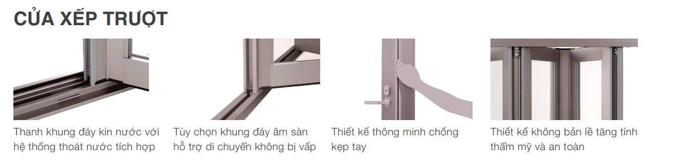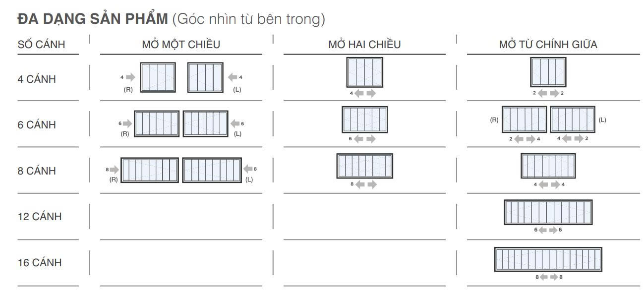 Cửa xếp trượt TOSTEM Nhật Bản 3 loại: cửa xếp trượt 4 cánh, cửa xếp trượt 6 cánh, cửa xếp trượt 8 cánh.